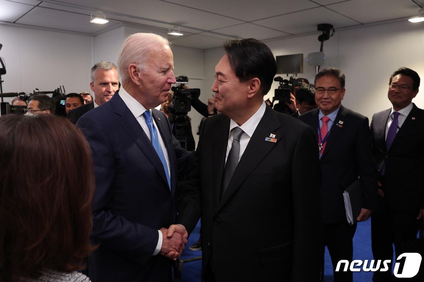 지난달 29일 오후(현지시간) 스페인 마드리드 이페마 국제회의장에서 한미일 정상회담 전 조 바이든 미국 대통령과 악수하는 윤석열 대통령의 모습. (대통령실 제공) 2022.7.3/뉴스1 ⓒ News1 안은나 기자