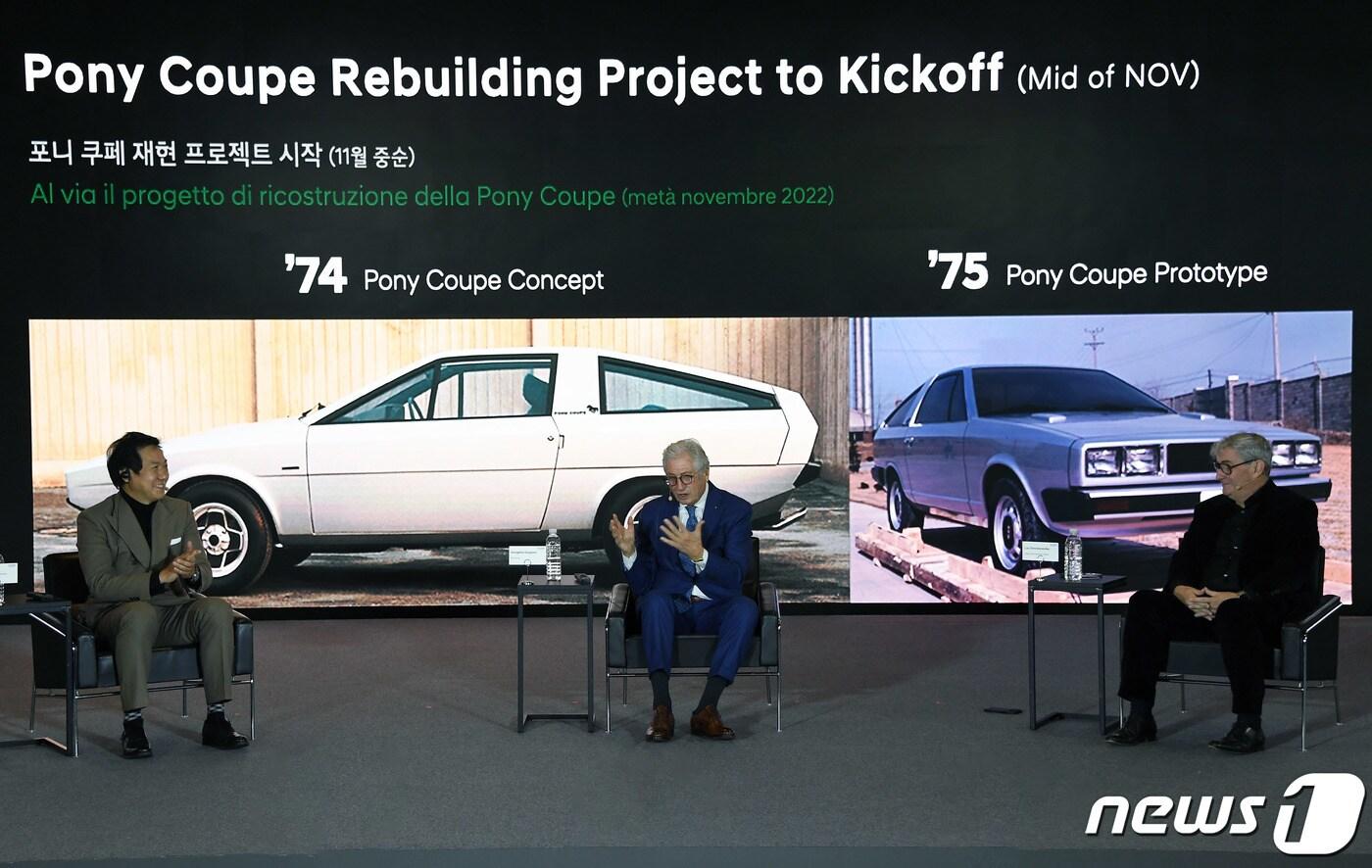 현대자동차는 인재개발원 마북캠퍼스 비전홀에서 디자인 토크 행사를 열었다고 24일 밝혔다. 이 자리에서 1974년 이탈리아 토리노 모터쇼에서 현대차가 선보였던 ‘포니 쿠페 콘셉트’를 원형 그대로 복원하는 프로젝트를 시작한다고 공개했다. 이상엽 현대디자인센터장 부사장(왼쪽부터), 디자이너 조르제토 주지아로, 현대차그룹 CCO 루크 동커볼케 부사장이 대화를 나누고 있다. (현대자동차 제공) 2022.11.24/뉴스1