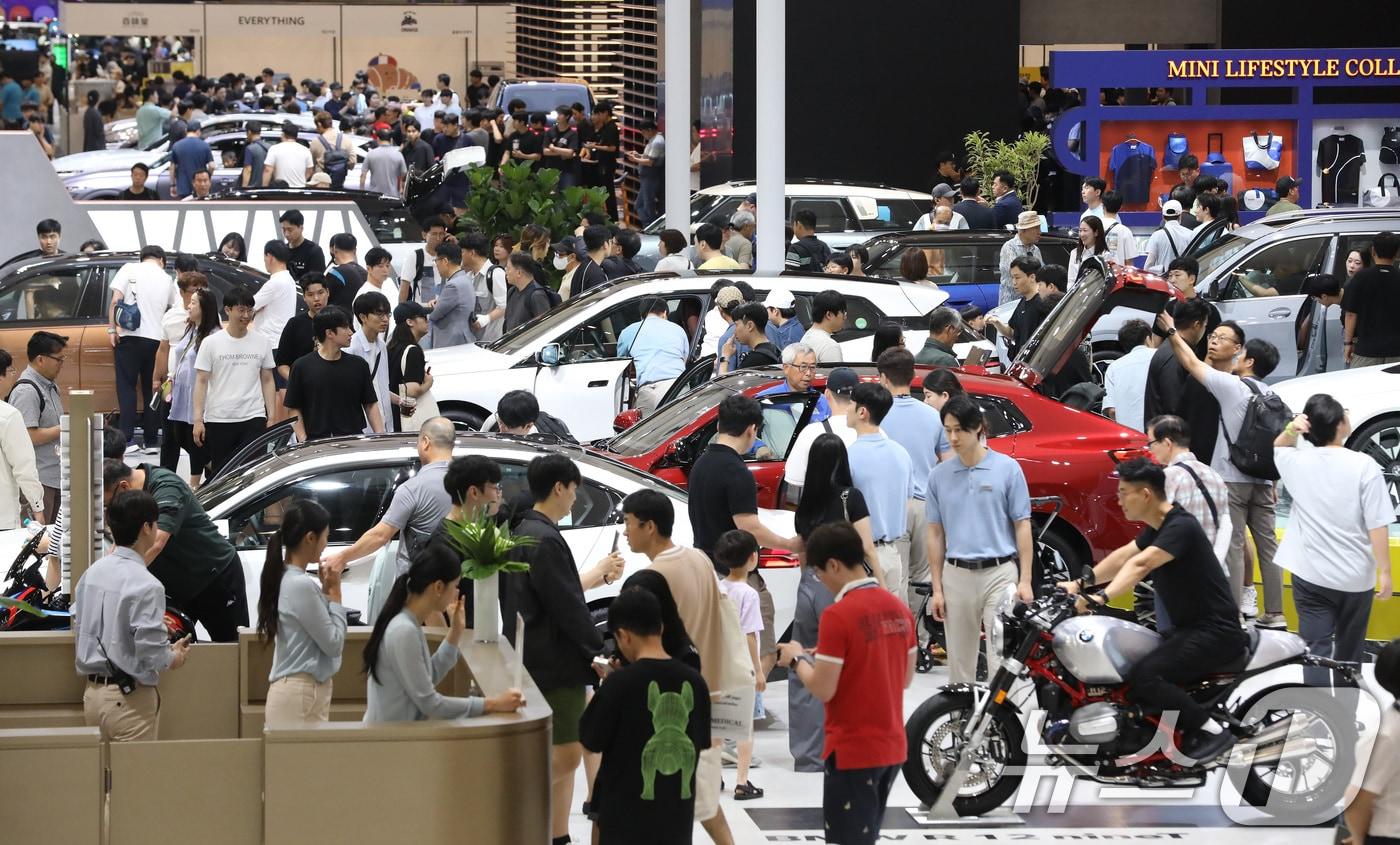 28일 부산 해운대구 벡스코 제1전시장에서 열린 '2024 부산모빌리티쇼'가 관람객들로 북적이고 있다. 이날 개막해 다음달 7일까지 '넥스트 모빌리티, 세상의 중심이 되다'를 주제로 열리는 이번 부산모빌리티쇼에는 국내외 7개 완성차 브랜드가 총 59대의 차량을 전시한다. 2024.6.28/뉴스1 ⓒ News1 윤일지 기자