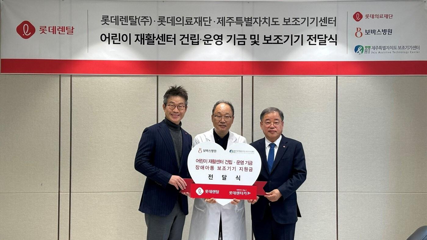 어린이재활센터 건립 및 장애아동 보조기기 지원에 사용롯데렌탈이 지난 20일 경기도 하남 보바스어린이재활센터에서 롯데의료재단과 제주특별자치도 보조기기센터에 기부금 5000만 원을 전달했다. (사진 왼쪽부터) 롯데렌탈 최진환 대표이사, 보바스어린이의원 윤연중 의원장, 김천주 롯데의료재단 이사장(롯데렌탈 제공). 2024.12.24.관련 키워드롯데렌탈친환경 기부 드라이빙롯데렌탈(주)김성식 기자 KGM 전국 130개 대리점 간담회…판매 우수점 시상볼보차코리아, 올해 차세대 전기차 'EX90'·'ES90' 출시…SDV 속도전