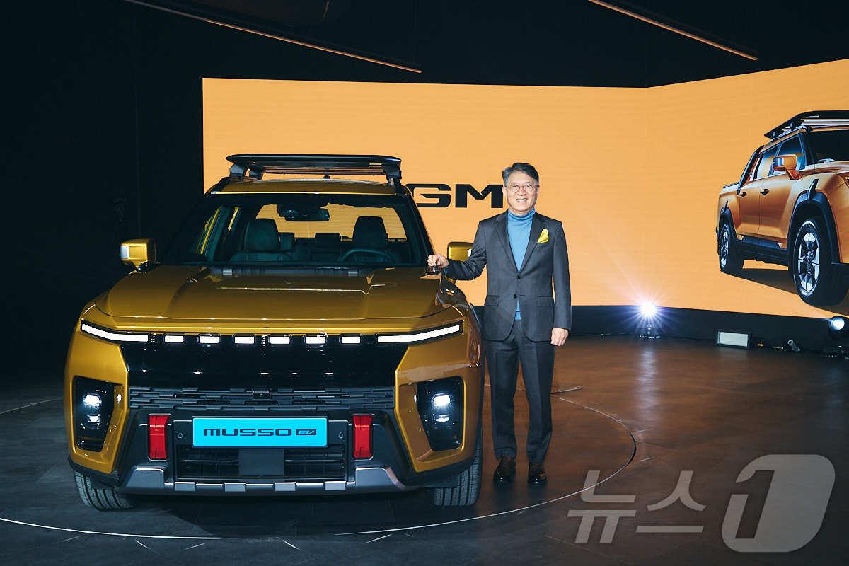 5일 오전 경기도 평택에 위치한 KGM 본사에서 열린 무쏘 EV 신차발표회에서 곽재선 KGM 회장이 기념 촬영을 하고 있다. (KGM 제공)