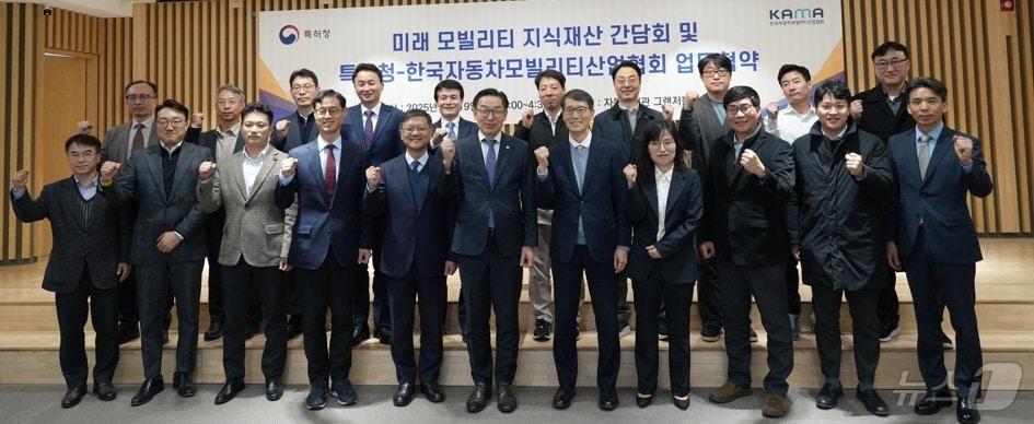 특허청이 19일 오후 서울 서초구 자동차회관에서 개최한 미래 모빌리티 지식재산 산·학·연 협업 방안 간담회에서 관계자들이 기념 사진을 촬영한 모습(특허청 제공). 특허청이 한국자동차모빌리티산업협회와 마련한 이번 간담회에는 현대자동차, 르노코리아 등 2개 완성차업체, 현대모비스, 현대트랜시스, 현대위아, 한온시스템, HL만도, 에스엘, 남양넥스모, 팅크웨어 등 8개 부품업체, 한국자동차연구원, 한국자동차공학회, 자율주행기술개발혁신사업단, 한국자동차산업협동조합 등 4개 유관기관이 참여했다. 2025.03.19.