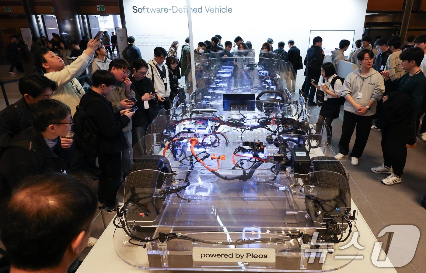 현대자동차그룹이 28일 서울 강남구 코엑스에서 열린 국내외 개발자들을 초청해 개발자 콘퍼런스 'Pleos 25'에서 E&E(전자·전기) 아키텍처를 공개하고 있다. Pleos Vehicle OS는 차량을 소프트웨어 중심으로 운영할 수 있도록 설계된 운영체제로, E&E(전자·전기) 아키텍처를 기반으로 차량이 지속적으로 연결되고 업데이트될 수 있도록 지원하는 핵심 기술이다. 2025.3.28/뉴스1 ⓒ News1 허경 기자