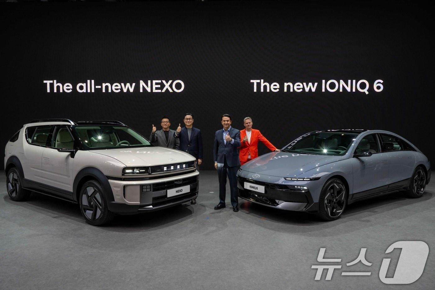 3일 경기 고양시 킨텍스 제1전시관에서 열린 ‘2025 서울모빌리티쇼’ 현대자동차관 보도발표회에서 현대외장디자인1팀 최홍석 책임연구원(왼쪽부터), 국내사업본부장 정유석 부사장, 대표이사 호세 무뇨스, 현대디자인센터장 사이먼 로스비 전무가 디 올 뉴 넥쏘, 더 뉴 아이오닉 6와 함께 기념촬영을 하고 있다. (현대차 제공. 재판매 및 DB 금지) 2025.4.3/뉴스1