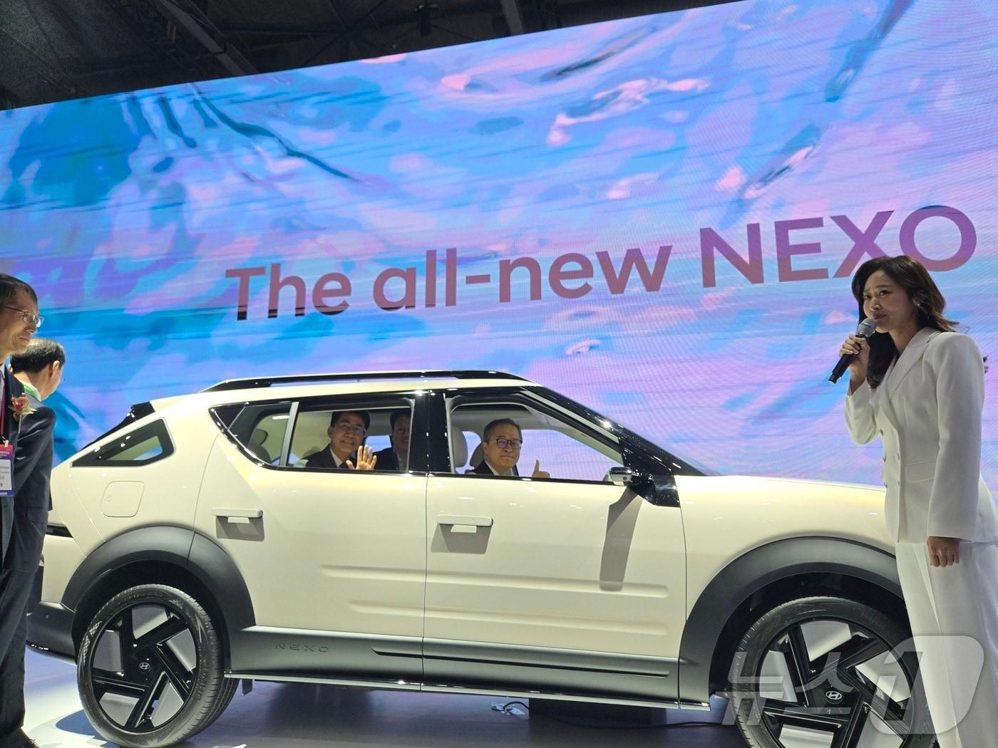 4일 오전 경기 고양 일산 킨텍스에서 열린 '2025 서울모빌리티쇼' 현대자동차 부스에서 이승렬 산업통상자원부 산업정책실장(1열)과 김동욱 현대차 부사장(2열 왼쪽)이 현대차 신형 수소전기차(FCEV) '디 올 뉴 넥쏘'에 탑승해 손을 흔들고 있다/뉴스1 2025.04.04. 김성식 기자