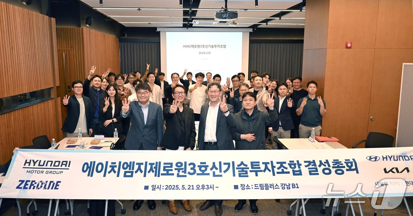 21일 서울 서초구 소재 드림플러스 강남에서 노규승 현대자동차그룹 제로원실장, 강덕범 현대차증권 IB본부장을 비롯한 그룹 계열사 관계자 40여명이 '제로원(ZER01NE) 3호 펀드' 결성 총회 후 기념 사진을 촬영했다(현대차그룹 제공). 2025.05.21.