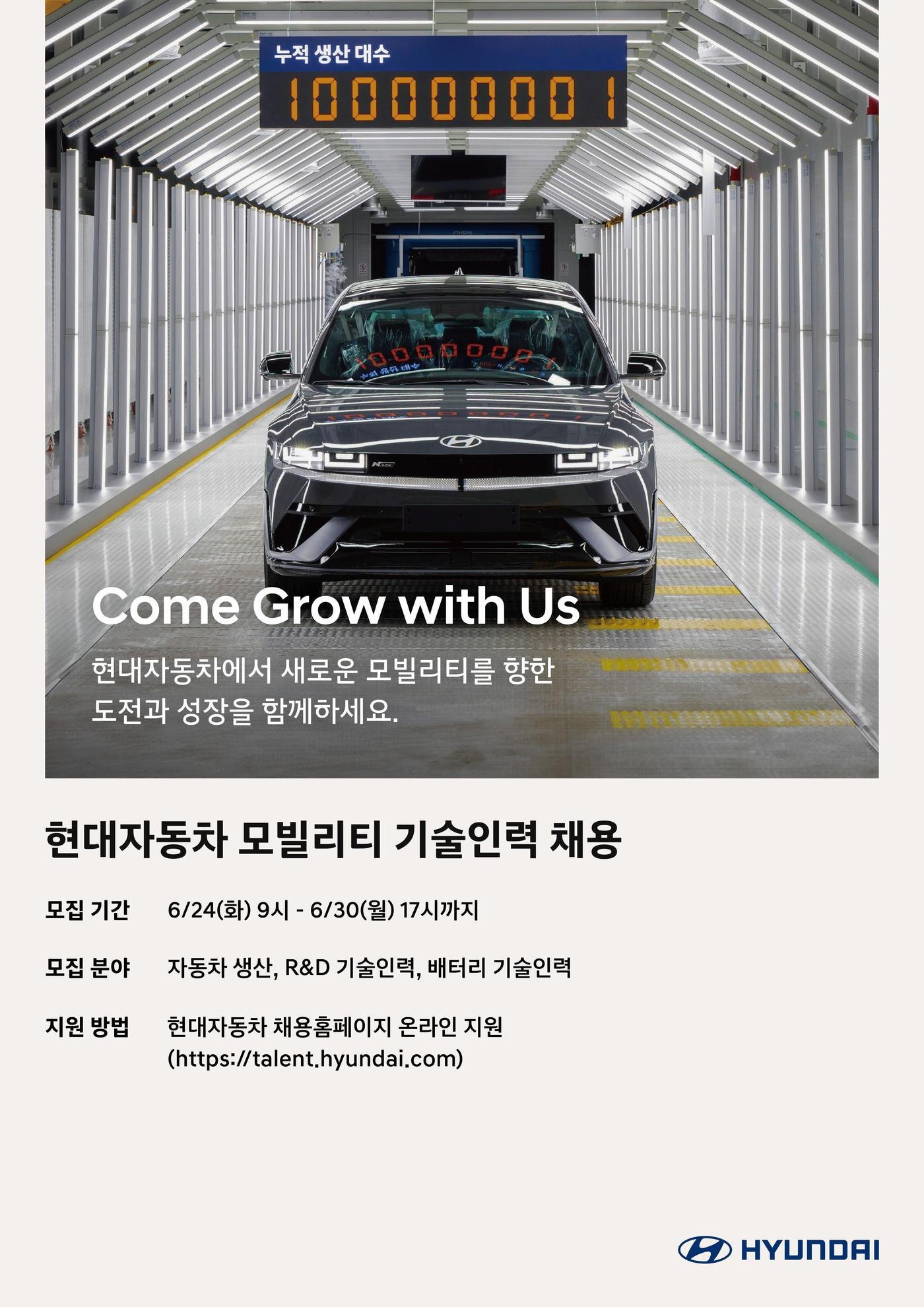 (현대자동차 제공). 2025.06.20.관련 키워드현대자동차채용브랜드현대차김성식 기자 한화엔진, 노르웨이 SEAM 2800억 원에 인수…북유럽 시장 공략파라타항공, 비즈니스석 본격화…국제선 서비스 차별화 나서관련 기사현대차 10월 신입·경력사원 채용…사업 전부문서 모집李 "응답하라 청년고용"…삼성 등 7개 그룹 10.4만명 채용(종합3보)李 청년고용 요청에 화답…삼성 등 6개 그룹 4만명 채용(종합2보)현대차그룹, 올해 청년 신규 채용 7200명…내년 1만명 확대 검토[중고차 지각변동]①대기업 빗장 해제…신뢰 향상 vs 가격 상승