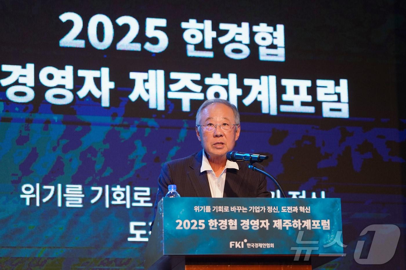 류진 한경협 회장이 16일 제주 롯데호텔에서 열린 ‘2025 한경협 CEO 제주하계포럼’에서 인사말을 하고 있다. 이번 포럼은 16일부터 19일까지 제주도 롯데호텔에서 ‘위기를 기회로 바꾸는 기업가정신, 도전과 혁신’을 주제로 열리며 500여 명의 기업인이 참가해 기업가정신과 미래 전략을 모색할 예정이다.(한경협 제공) ⓒ News1 최동현 기자