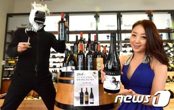 유니콘·에쿠스·검은 종마 등 '말 이미지' 활용지난달 31일 서울 송파구 오금동 나라셀라 본사에서 열린 '2014년 청말띠 와인 행사'에서 모델이 포즈를 취하고 있다. 와인수입사 나라셀라는 오는 15일까지 전국 주요 백화점 및 프리미엄 와인숍 등에서 '말띠 와인'을 최고 40% 할인판매한다. (나라셀라 제공) 2013.12.31/뉴스1 © News1