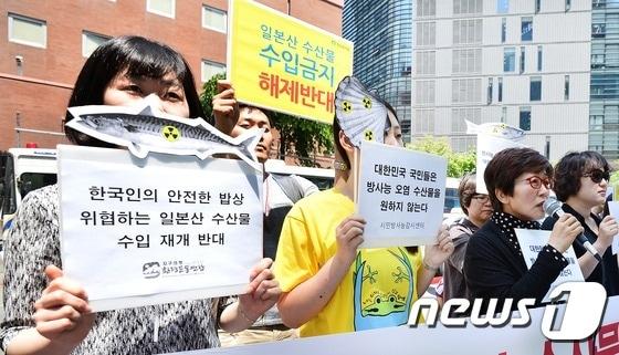 소비자원 2014년 원전사고 소비자 인식 설문조사 보니53% "수산물 오염 우려"…67% "정부 조치 모른다" 불신환경운동연합과 시민방사능감시센터 등 10개 환경단체가 22일 오전 서울 종로구 일본대사관 앞에서 열린 기자회견에서 방사능오염 수산물 수입 강요하는 일본정부를 규탄하고 있다. 2015.5.22/뉴스1 ⓒ News1 박지혜 기자