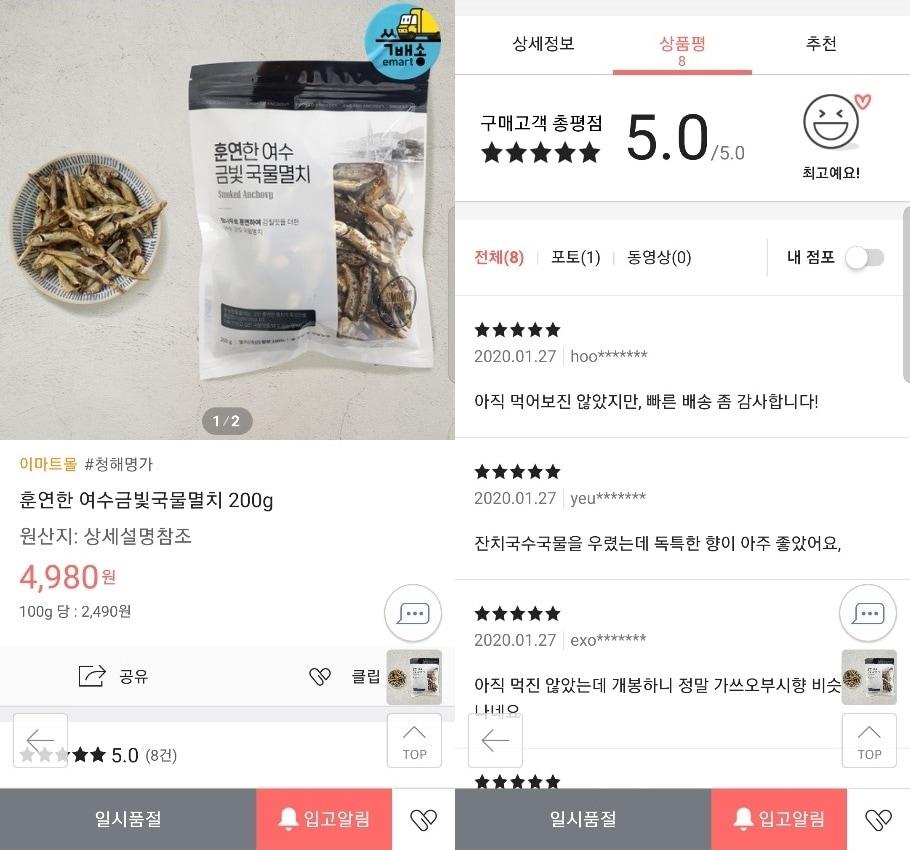 6일 새 준비물량 5000개 팔려…이마트에서 상시 판매 계획크키가 크고 건조·보관 어려운 '여수 대멸치', 훈연해 상품성↑훈연한 여수 금빛 국물멸치가 SSG닷컴에서 현재 품절 상태다. ⓒ 뉴스1(SSG닷컴 갈무리)SBS 맛남의광장 갈무리 ⓒ 뉴스1