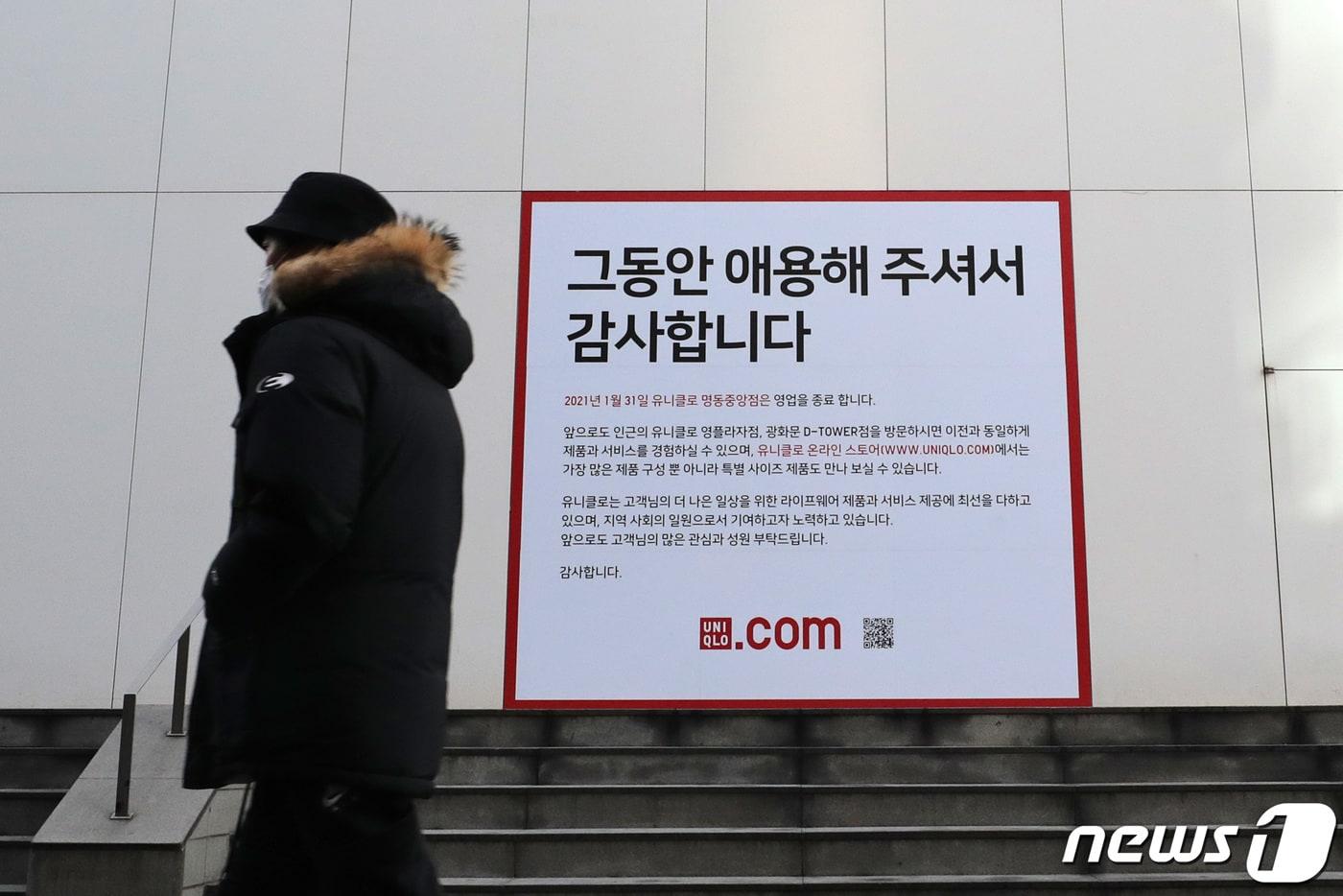 지난달 31일 오전 서울 중구 유니클로 명동중앙점에 31일을 끝으로 운영을 종료한다는 폐점 안내문이 붙어있다. 플래그십 스토어인 유니클로 명동중앙점은 노재팬 운동과 코로나19로 인한 명동 상권 타격으로 이날까지 운영하고 문을 닫게된다. 2021.1.31/뉴스1 ⓒ News1 이성철 기자