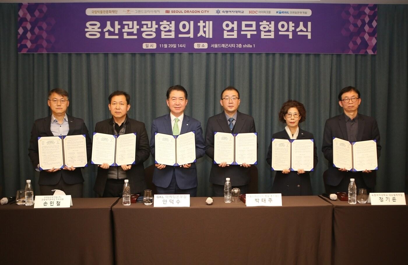 HDC아이파크몰은 이달 29일 서울드래곤시티에서 '용산관광협의체' 발족 및 업무 협약을 체결 했다. 사진은 김시성 HDC아이파크몰 경영지원실장(왼쪽부터), 손민철 코레일관광개발 관광레저본부장 직무대행, 안덕수 GKL 마케팅본부장, 박태주 서울드래곤시티 총괄지배인, 정기은 숙명여자대학교 대외협력처장, 정성욱 국립박물관문화재단 국장 등이 참석해 업무협약 체결 후 기념촬영을 하고 있다.(HDC아이파크몰 제공)
