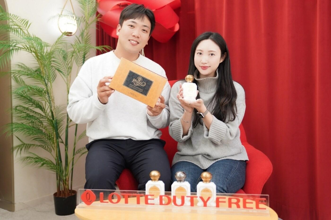 모델들이 다음달 1일부터 롯데면세점에서 진행하는 밸런타인데이 할인전에서 판매 예정인 초콜릿·향수 등을 소개하는 모습(롯데면세점 제공).