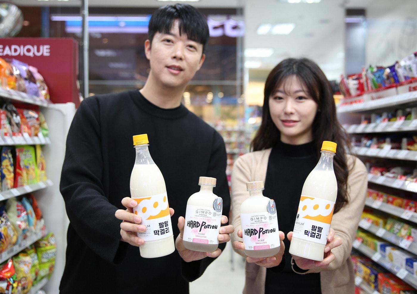 GS25에서 모델이 힙걸리 프로젝트 2탄 상품 팔팔막걸리와 하드포션을 들고 포즈를 취하고 있다(GS25 제공)./