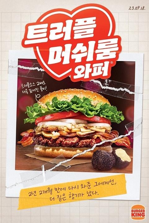 SNS통해 '버섯'관련 포스팅…"모두가 기다린 와퍼가 왔어요"트러플 마요 소스에 버섯 4종 버거…상시 판매 여부는 물음표지난해 재출시 당시 트러플 머쉬룸 와퍼 포스터.(버거킹 제공)관련 키워드버거킹이형진 기자 계열사 앞에서 끌던 SPC, 상미당홀딩스 전환으로 글로벌 후방 지원"'두바이 스초생'은 어떤 맛일까"…투썸플레이스 "출시 긍정 검토"관련 기사'운명의 일주일' 프랜차이즈 업계…피자헛 차액가맹금 대법 판결 촉각비건 열풍 끝?…글로벌 식물성 먹거리 개척하는 K-푸드동두천 버거킹에 車 돌진…"바닥 고정 테이블이 참사 막았다"(종합)동두천 버거킹 매장으로 승용차 돌진…3명 부상신메뉴 내고, IP 협업하고…크리스마스 버거 대전