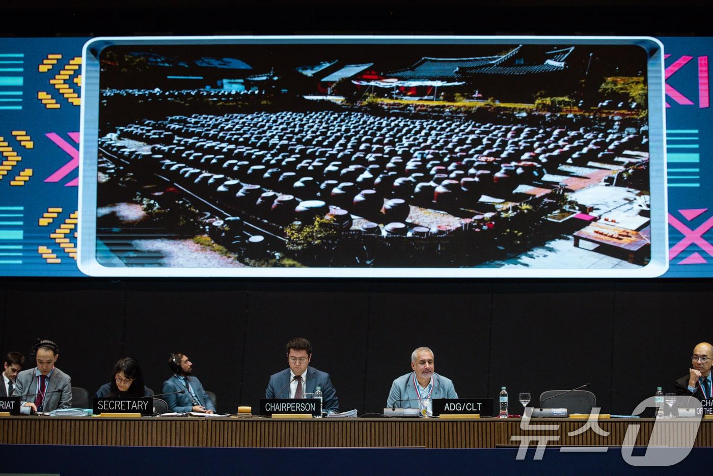 3일(현지시간) 파라과이 아순시온에서 열린 제19차 유네스코 무형유산보호협약 정부간위원회에서 카몰 무카타로브로 부의장이 ‘한국의 장 담그기 문화’의 유네스코 인류무형유산 등재를 선언하고 있다. ‘한국의 장 담그기 문화’는 공동체의 평화와 소속감을 조성하고, 문화다양성 증진에 기여함을 인정받아 한국의 23번째 유네스코 인류무형유산으로 이름을 올리게 되었다. (국가유산진흥원 제공) 2024.12.4/뉴스1
