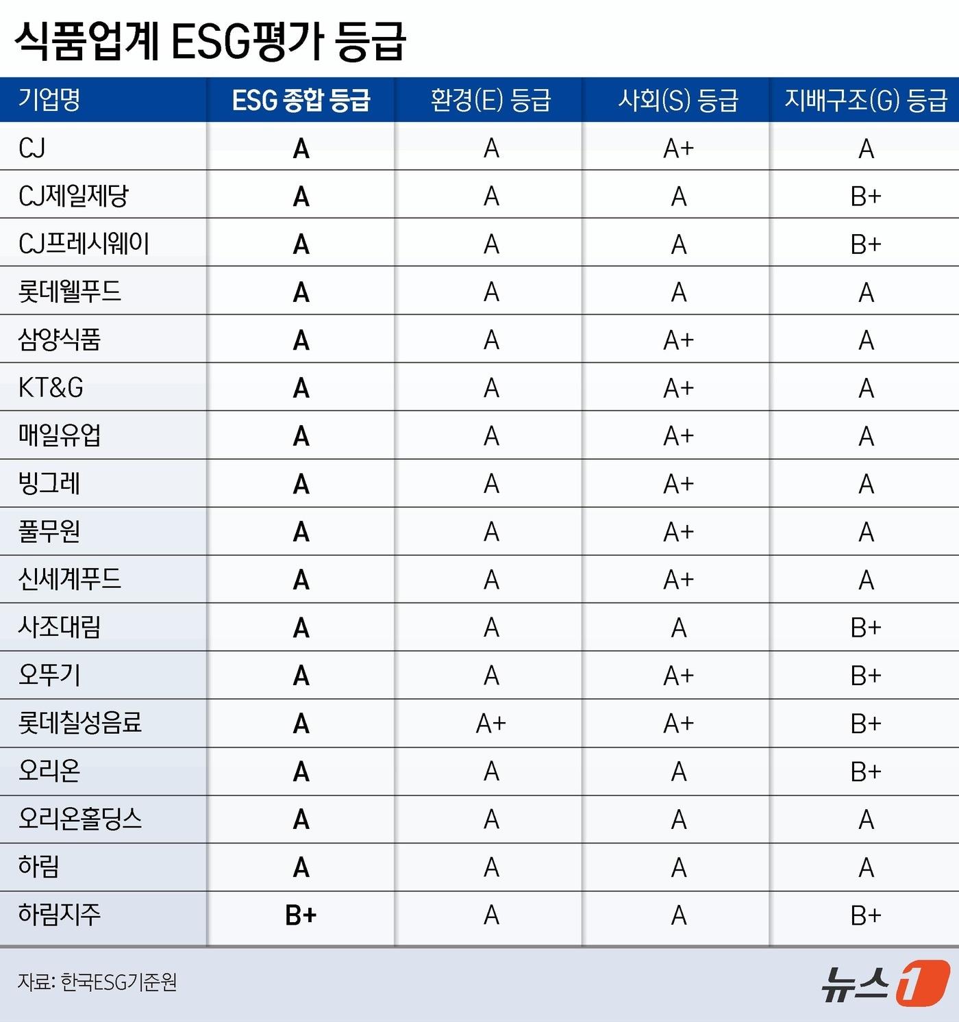 KCGS ESG 평가…CJ계열사 종합등급 A, 삼양식품·KT&G 등도 A사회 부문에 A+ 몰려…"장기적으로 환경·지배구조도 노력 이어야"ⓒ News1 윤주희 디자이너ⓒ News1 윤주희 디자이너관련 키워드CJCJ제일제당CJ프레시웨이삼양식품KT&G롯데칠성음료풀무원오리온이형진 기자 "7500원 두바이 붕어빵도 나왔다"…없어서 못 먹는 '두쫀꾸 열풍'하리보, 부드러운 식감의 소프트 젤리 '스퀴시' 국내 출시관련 기사유통가 실적 희비…뷰티 날개·패션 보릿고개올해 주요 식품사 '4조 클럽' 5곳…삼양식품 '2조 클럽' 입성 가시권이재현 CJ 회장, 젊은 임직원들과 소통…"도전 없이 성장 없다"[인사] CJ그룹"책임경영 기조 강화"…CJ, 2026년 임원 인사 오후 발표