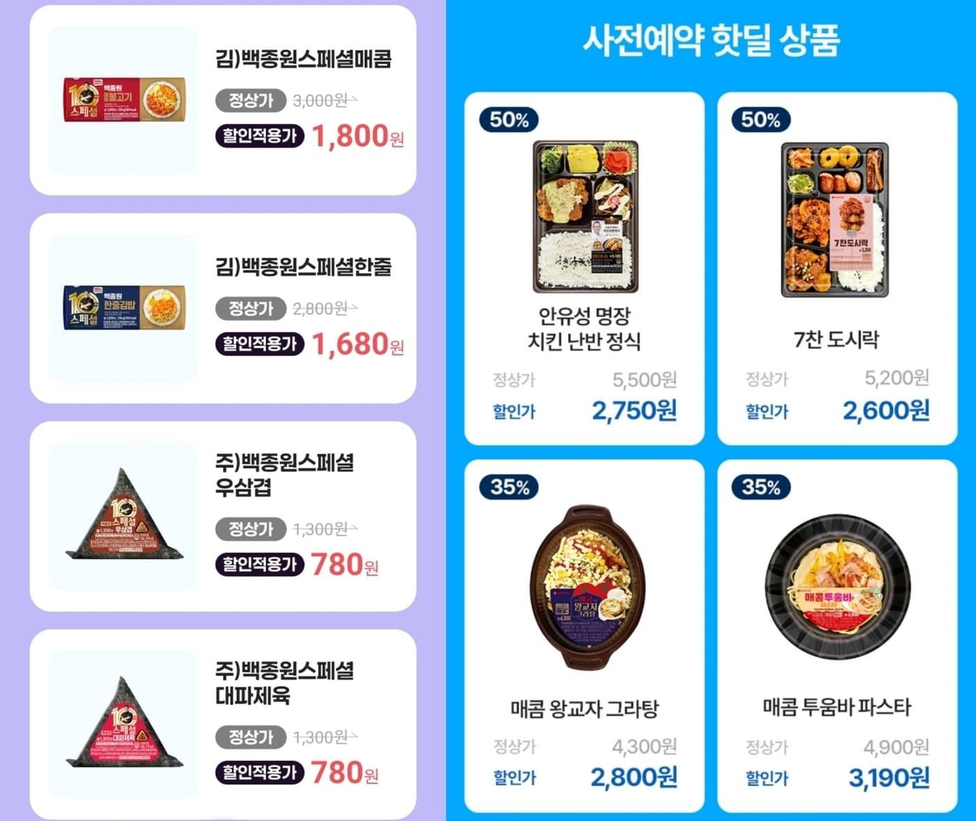 세븐일레븐 '사전예약 핫딜' 행사…도시락 2600원CU 40% 할인·이마트24 50% 할인 쿠폰 증정 CU 백종원 간편식 40% 할인 공지(왼쪽)와 세븐일레븐 '사전예약 핫딜' 행사 화면 갈무리. (이마트24 제공).관련 키워드CUGS25이마트24세븐일레븐윤수희 기자 홈플러스 "RCPS 자본전환·토지 자산재평가…정당한 회계처리"조선호텔앤리조트, '2026 조선호텔 설 선물 세트' 사전 판매 개시관련 기사"결혼·장례식 꽃까지 챙긴다?"…나라사랑카드 경쟁, 혜택 어디까지?[뉴스톡톡] 인기 부활한 '두쫀쿠' 대란…왜 가격이 비쌀까'붉은 말의 해' 떴다…새해 첫 할인·프로모션 '풍성'안면결제 시장 2030년 27조 전망…유통업계 도입 속도세븐일레븐·이마트24 '전략 점포' 본격화…편의점 판도 교체 '선봉'