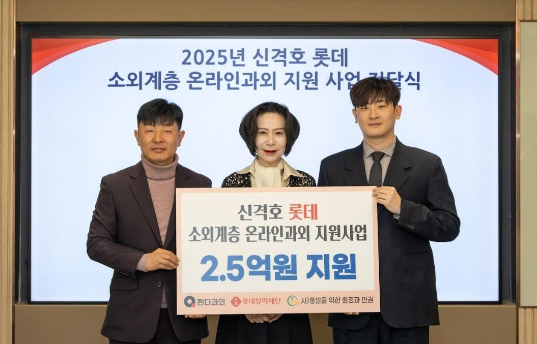 장혜선 이사장 "교육 격차 해소 위한 선순환 시작점 되길"장혜선 롯데장학재단 이사장(가운데)과 이은택 통일을위한환경과인권 대표(왼쪽), 이종흔 콴다과외 CEO(오른쪽)가 전달식 기념 사진을 촬영하고 있다. (롯데장학재단 제공)관련 키워드롯데장학재단장혜선김명신 기자 '품절 대란' 스타벅스 럭키백, 출시 당일 저녁 '완판'인기 플레이버 한자리에…배스킨라빈스, '스트로베리 페스타' 진행관련 기사롯데재단 2025년 송년회 개최…기존 사업 결산, 새 사업 공개도롯데장학재단, 제2회 신격호샤롯데문학상 시상식 개최롯데장학재단, 복지시설 및 난방 취약가구에 난방설비 지원롯데장학재단, '신격호 롯데 청년기업가대상' 시상식 개최롯데장학재단, 베트남 10개 대학에 장학금 전달…"16년째 인연"