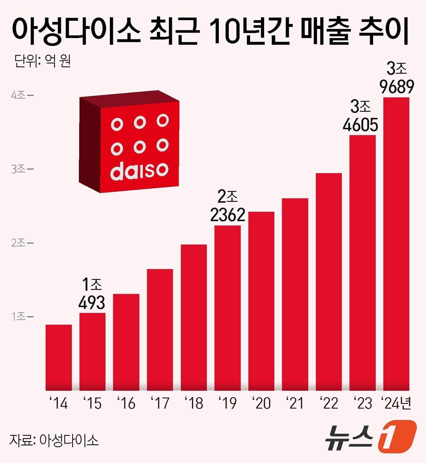 2010년대 들어 빠르게 성장…2023년 '3조 고지' 올라'박리다매+다양성' 전략 주효…규모의 경제로 수익성 ↑ⓒ News1 김지영 디자이너13일 오후 서울 용산구에 위치한 한 다이소 매장을 찾은 시민이 물품을 구매하고 있다. 2023.12.13/뉴스1 ⓒ News1 장수영 기자관련 키워드다이소윤수희 기자 홈플러스 "RCPS 자본전환·토지 자산재평가…정당한 회계처리"조선호텔앤리조트, '2026 조선호텔 설 선물 세트' 사전 판매 개시관련 기사"서울 가면 예뻐진다" 입소문에…전 세계 '글로우매즈' 몰려온다탈모 케어도 대중화…뷰티 업계 '프리미엄→초저가' 전략 선회두바이까지 뻗친 '한류 베끼기'…중국 짝퉁 기업, KR 간판 버젓이 올렸다다이소, 다이소몰서 토스페이 결제시 2% 할인…최대 2000원KAIST 기술 기반 그래비티, 4000원대 소용량 샴푸 이마트 독점 출시