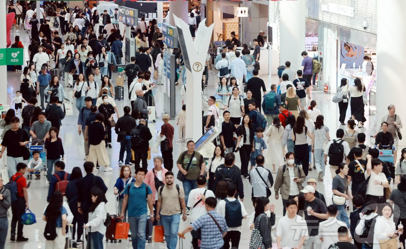 현충일 연휴가 시작된 6일 오전 인천국제공항 제1터미널 면세점이 관광객들로 붐비고 있다.2025.6.6/뉴스1 ⓒ News1 김진환 기자