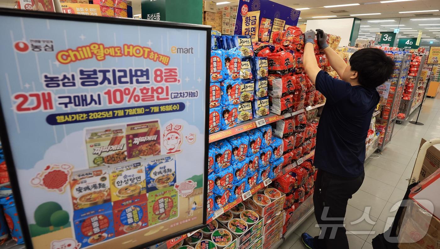 식음료 및 외식물가가 연이어 오르고 있는 가운데 정부와 식품·유통업계가 먹거리 물가 부담을 낮추기 위해 여름 휴가철에 대규모 할인 행사에 나선다고 밝혔다. 이에 따라 대형마트와 편의점들은 소비자들이 주로 찾는 라면과 빵, 커피 등을 최대 50% 저렴하게 판매한다. 사진은 서울 시내 한 대형마트 라면 판매대에서 관계자가 진열하고 있는 모습. 2025.7.7/뉴스1 ⓒ News1 김진환 기자