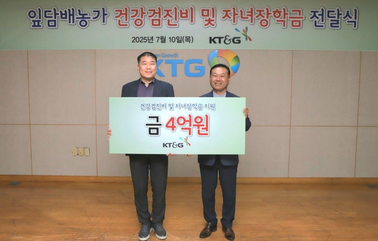 상생 지원 13년간 이어와…경작인 누적 1만 5800여 명 혜택KT&G는 고령화로 어려움을 겪는 잎담배 경작농가의 경제적 부담을 완화하고 상생경영을 실천하기 위해 2013년부터 잎담배 농가 특별지원사업을 꾸준히 이어오고 있다. 사진은 지난 10일 진행된 복지증진 지원금 전달식. (KT&G 제공)관련 키워드KT&G김명신 기자 벼랑 끝 홈플러스 'D-DAY'…분리매각·구조조정 카드 꺼냈다메가MGC커피 "포장재 재활용, 지자체 승인 받은 조치"관련 기사"통신 3사 망 품질 안정적"…KT 5G 속도 1위방미통위 "방송대상 수상작 무료로 보세요"KT&G, 제16회 KT&G SKOPF 최종사진가에 '하다원' 작가 선정[카드뉴스] "동종 산업 최초"…KT&G, MSCI ESG평가 'AAA' 등급 획득"치킨값 좀 벌어볼까"…연말 배당 막차 노리는 투자자들