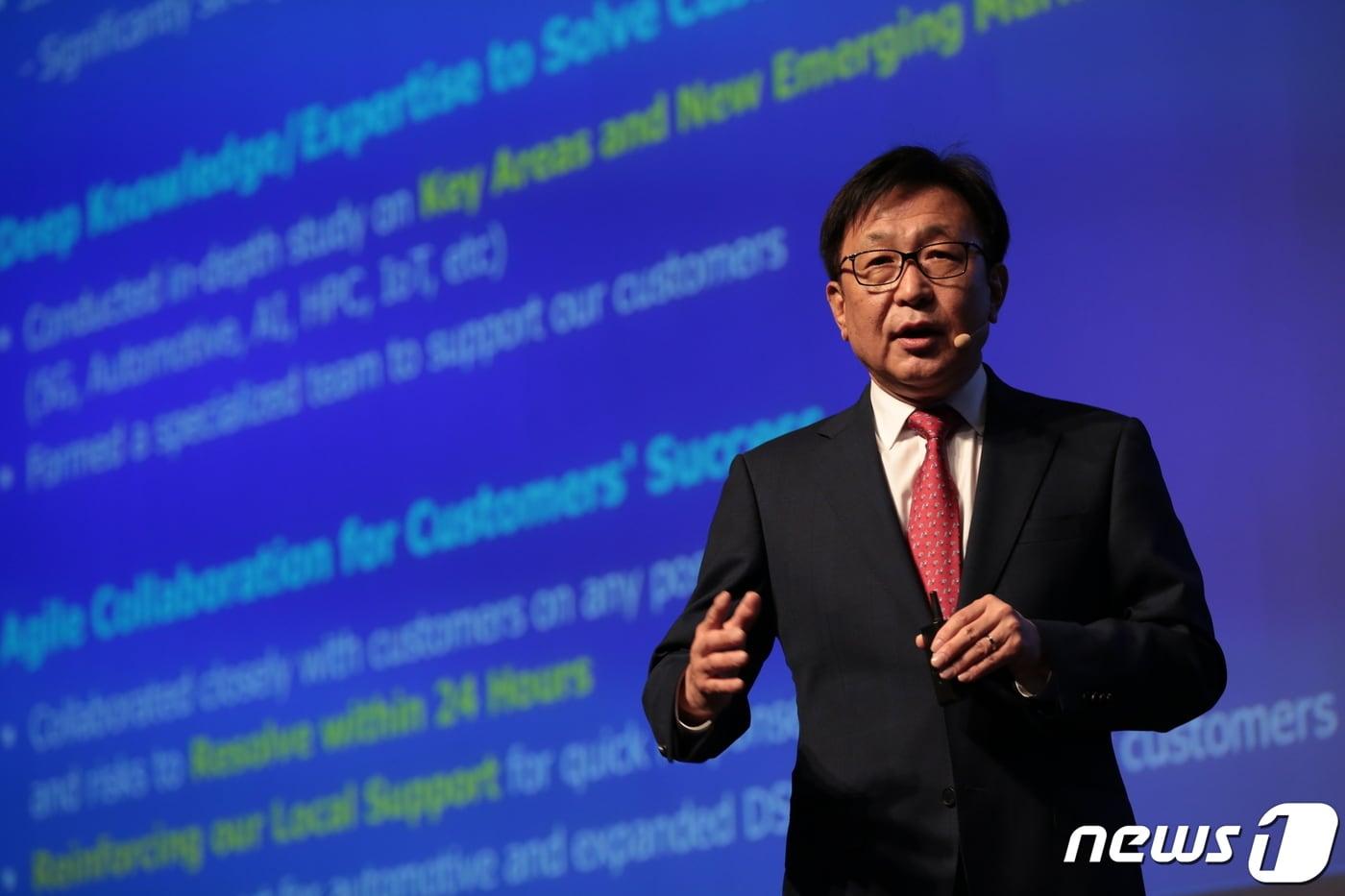 삼성전자 파운드리사업부 정은승 사장이 3일 서울 그랜드 인터컨티넨탈 파르나스 호텔에서 열린 '삼성파운드리 포럼 2019 코리아' 행사에서 기조 연설을 하고 있다. (삼성전자 제공) 2019.7.3/뉴스1