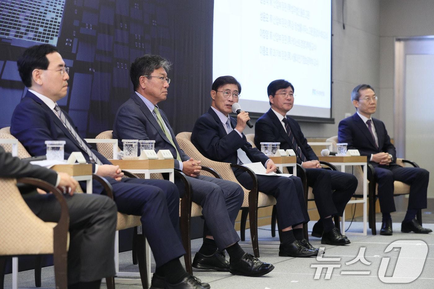 이윤호 전 지식경제부 장관이 14일 서울 여의도 FKI타워 컨퍼런스센터에서 열린 '역대 산업부장관 초청 특별대담'에서 발언하고 있다. 왼쪽부터 이창양 전 산업통상자원부 장관, 윤상직 전 산업통상자원부 장관, 이윤호 전 지식경제부 장관, 성윤모 전 산업통상자원부 장관, 이종호 전 과학기술통신부 장관. (한경협 제공) 2024.10.14/뉴스1