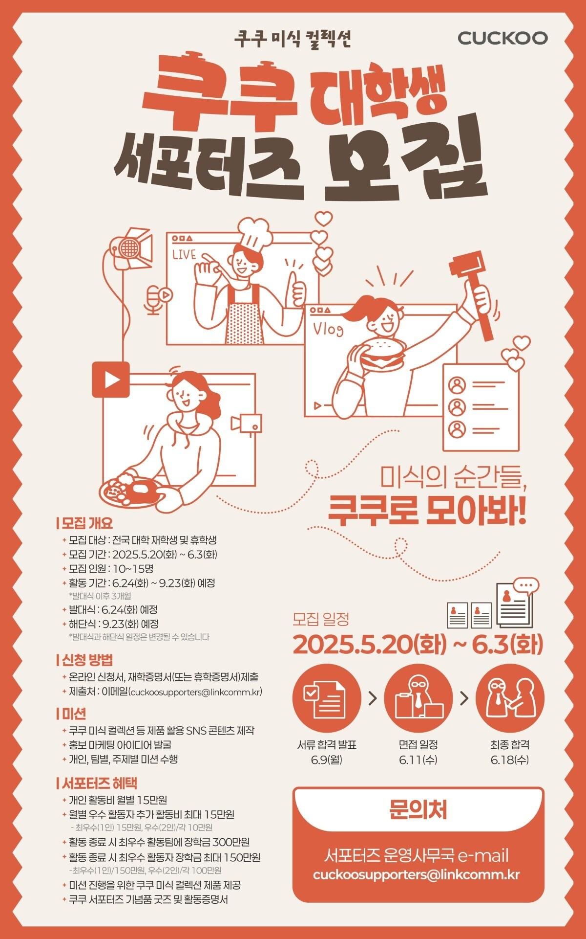 월 활동비 15만 원…최우수팀에는 300만 원 수여포스터 이미지 (쿠쿠 제공)관련 키워드쿠쿠홈시스대학생서포터즈가전홍보SNS이민주 기자 벤처업계 "중소기업 해외진출 촉진법 환영…조속히 제정해야""부·울·경 기술 中企 자금지원"…기보, 주금공과 맞손