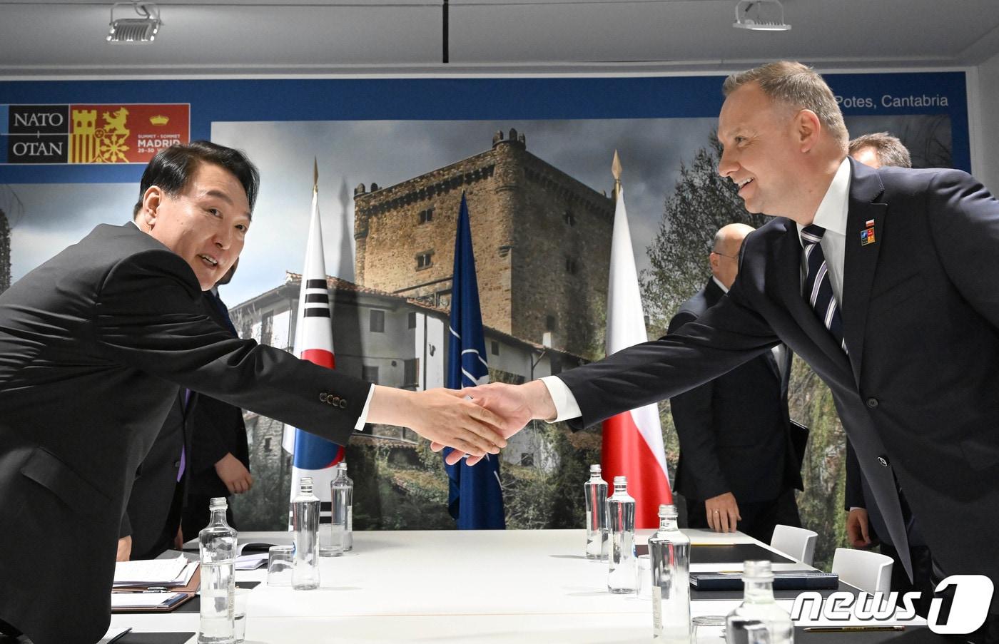 K2 전차·K9 자주포 등 1차 이행계약 17조…2차 진행 중금융지원 방식·규모 두고 폴란드와 협상…열쇠 쥔 정부윤석열 대통령과 안제이 두다 폴란드 대통령이 지난해 6월29일 오후(현지시간) 스페인 마드리드 IFEMA 양자회담장에서 열린 한·폴란드 정상회담에서 악수하고 있다. (대통령실사진기자단) 2022.6.29/뉴스1 ⓒ News1 오대일 기자박주평 기자 신학철 "친환경·고부가 전환, 화학산업 50년 번영 유일한 길""이천 쌀집 안부럽다"…삼성 반도체, 연봉 47% 성과급으로 받는다
