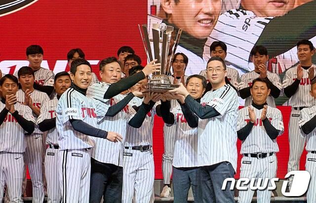 LG 트윈스 구단주인 구광모 LG 그룹 회장(앞줄 오른쪽)과 염경엽(왼쪽) LG 감독, 차명석 LG 단장(왼쪽 두 번째) 등이 17일 오후 서울 강서구 마곡 LG 사이언스파크 컨버전스 홀에서 열린 2023 프로야구 통합우승 기념행사에서 우승 트로피를 들고 기념 촬영을 하고 있다. (LG 트윈스 제공) 2023.11.17/뉴스1 ⓒ News1 김진환 기자