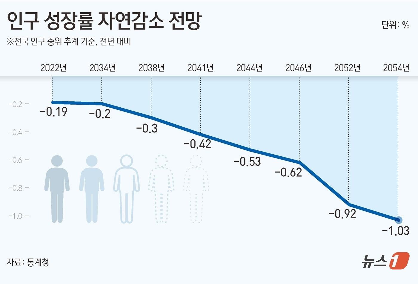 6일 통계청 장래인구추계에 따르면 2054년 전국 인구는 중위 추계 기준으로 전년보다 1.03% 감소할 전망이다. 인구성장률은 2022년 -0.19%에서 2034년 -0.20%, 2038년 -0.30%, 2041년 -0.42%, 2044년 -0.53% 등으로 점점 감소 폭이 커지게 된다. ⓒ News1 김초희 디자이너