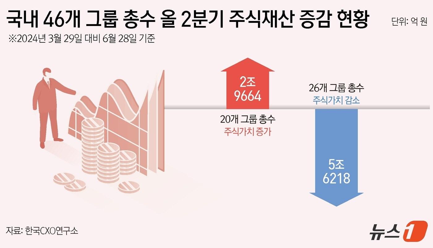 ⓒ News1 김초희 디자이너ⓒ News1 김초희 디자이너ⓒ News1 김지영 디자이너관련 키워드삼성전자효성셀트리온현대자동차카카오하이브아모레퍼시픽에코프로김재현 기자 최교진 장관 취임 후 첫 업무보고 마무리…지역 균형발전 점검(종합)교육부, 소관·유관기관 업무보고 마무리…지역 균형발전 기여 점검관련 기사대기업 오너 등기임원 겸직, 5년간 117→100건…총수 14명 미등기이재용 주식재산 '26조' 2배 껑충…선친 넘어 '역대 1위' 등극'4000피 시대' 대기업 시가총액 82% 증가…5대 그룹, 시총 비중 52.2%3분기 총수 45명 주식재산 4조↑…이재용 3.7조 증가, 방시혁 5655억 감소2Q 그룹 총수 44명 주식재산 16조↑…이재용 1위, 1조 클럽 16명