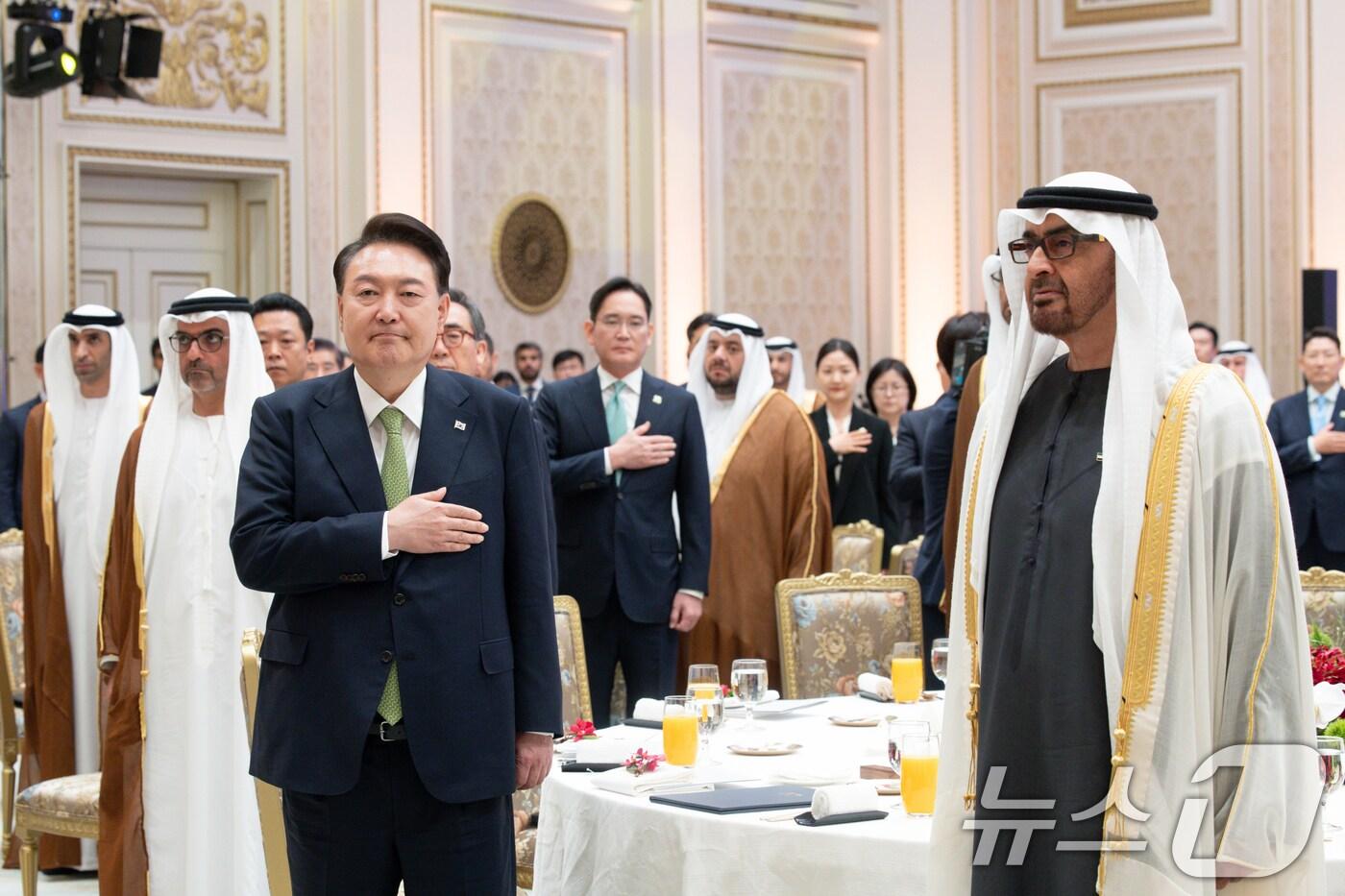 윤석열 대통령이 29일 청와대 영빈관에서 열린 모하메드 빈 자이드 알 나흐얀 아랍에미리트(UAE)대통령 국빈 오찬에서 국기에 경례하고 있다. (대통령실 제공) 2024.5.29/뉴스1 ⓒ News1 송원영 기자