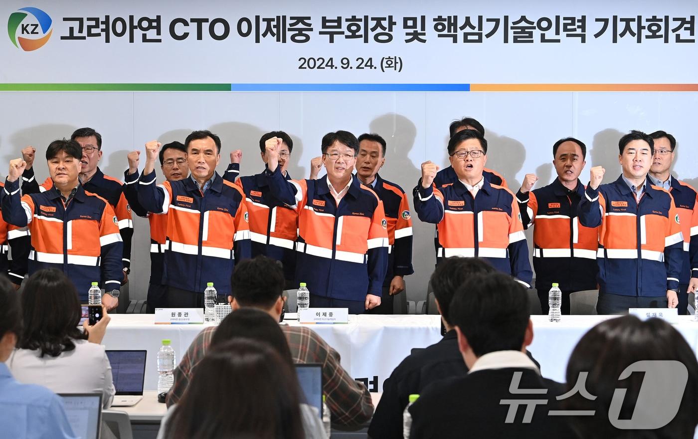 이제중 고려아연 부회장과 임직원들이 24일 오전 서울 종로구 고려아연 본사에서 열린 MBK파트너스·영풍과의 경영권 분쟁과 관련한 기자회견 중 구호를 외치고 있다. (공동취재) 2024.9.24/뉴스1 ⓒ News1 장수영 기자
