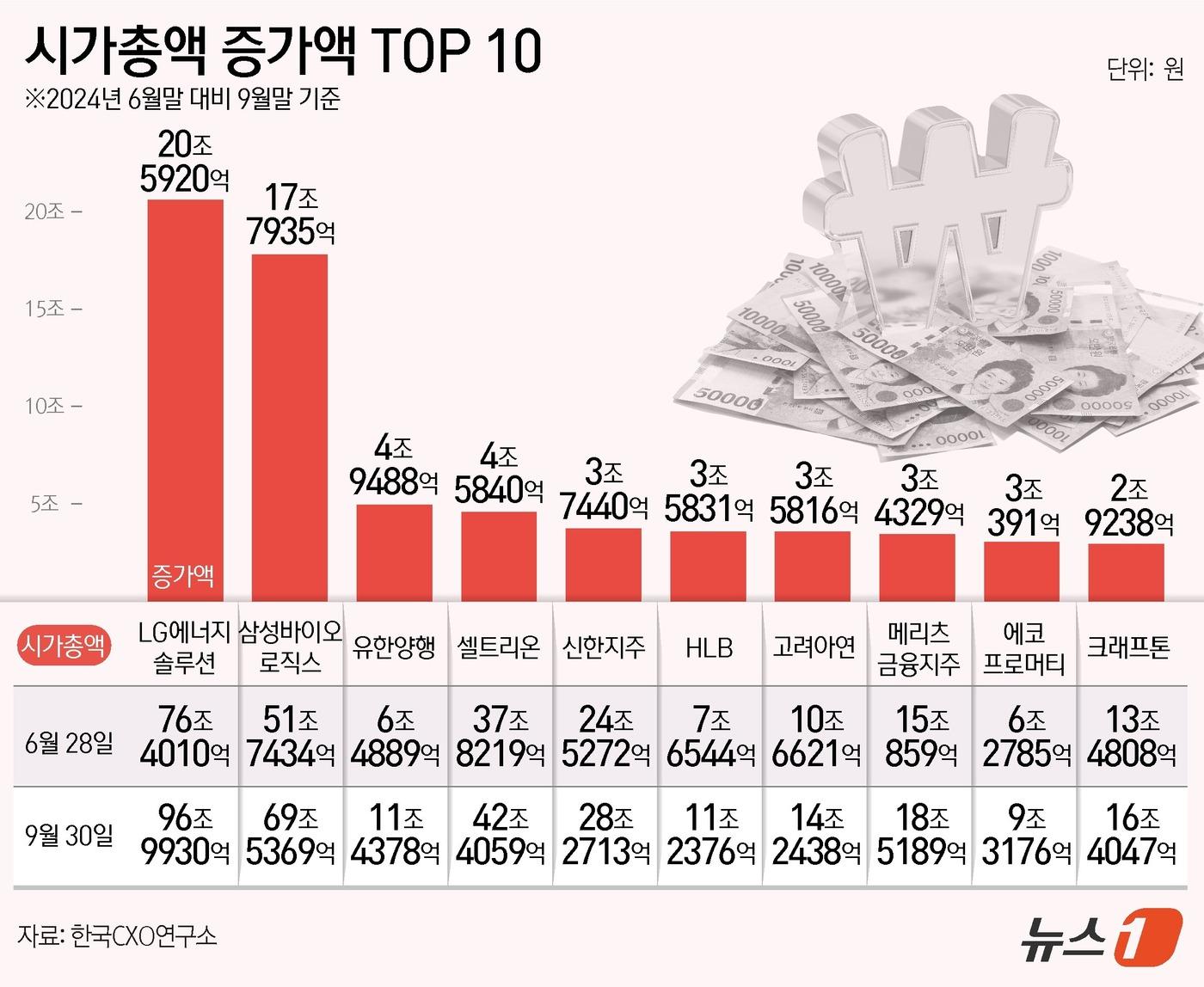 한국CXO연구소 '2024년 3분기 주식시장 시총 변동 현황' 분석3Q 전체 시총 190조↓…증가액 1위 LG엔솔·증가율 1위 보로노이ⓒ News1 양혜림 디자이너ⓒ News1 김지영 디자이너ⓒ News1 김초희 디자이너관련 키워드삼성전자LG에너지솔루션보로노이SK하이닉스기아현대차삼성바이오로직스유한양행김재현 기자 '일타' 현우진 "현직교사와 문항거래 맞지만 수급채널 중 하나일 뿐"'군인 자녀 학교' 한민고, 공립화 추진…교육부·국방부·경기교육청 MOU
