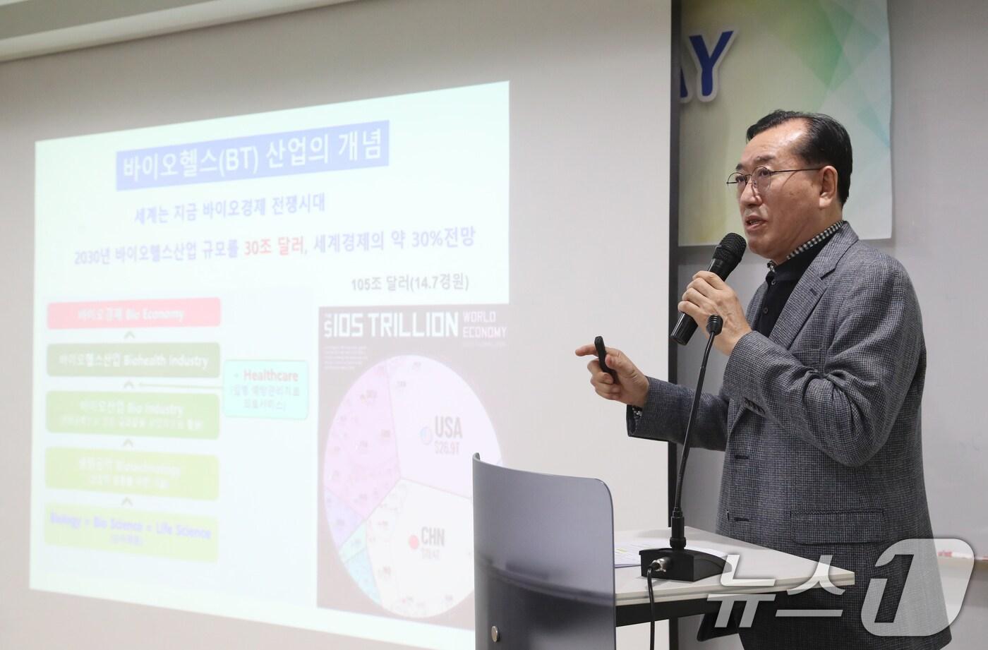 정광회 차의과대학교 생명과학대학 학장이 22일 오후 경기 성남시 분당구 글로벌디지털혁신네트워크(GDIN)에서 열린 '반려동물 산업 육성 협의회' 제8회 IR(기업설명회)데이에서 바이오헬스산업의 현황을 주제로 발표하고 있다. 2024.11.22/뉴스1 ⓒ News1 김영운 기자