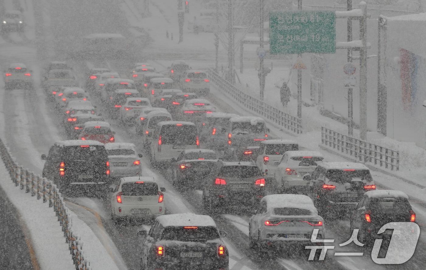 전국 곳곳에 최대 20㎝ 이상의 많은 눈이 내린 27일 경기 수원시 팔달구 경수대로 일대에서 차량이 서행하고 있다. 2024.11.27/뉴스1 ⓒ News1 김영운 기자