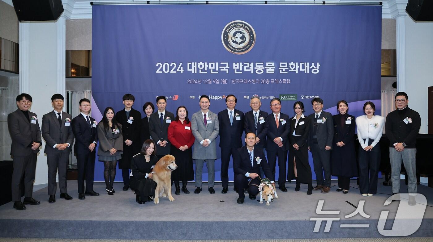 9일 서울 중구 프레스센터에서 뉴스1 주최로 열린 '2024 대한민국 반려동물 문화대상'에서 수상자들이 기념촬영을 하고 있다. ⓒ News1 김도우 기자