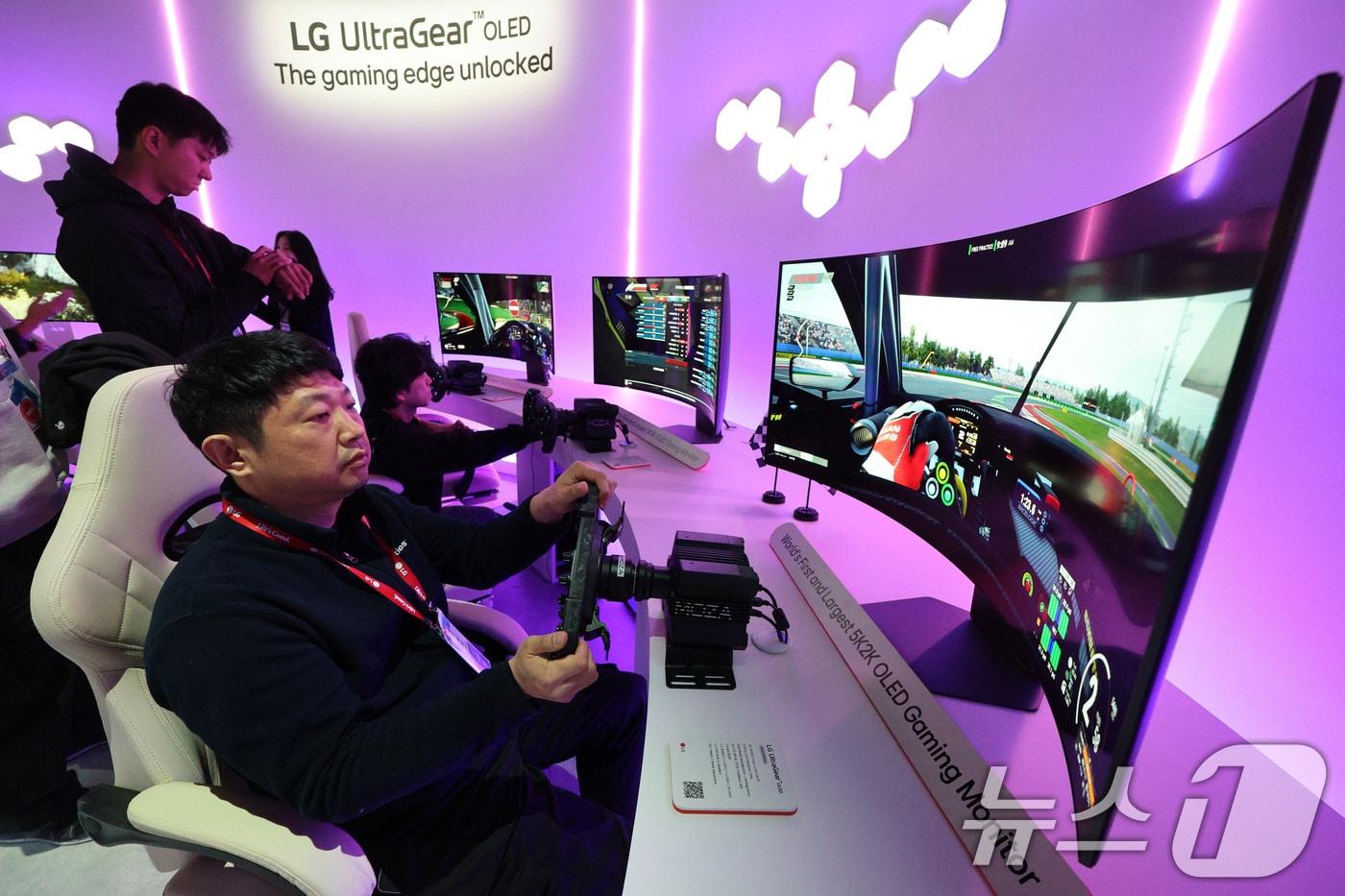 세계 최대 IT(정보기술)·가전 전시회 'CES 2025' 개막을 하루 앞둔 6일 오전(현지시간) 미국 네바다주 라스베이거스 컨벤션센터(LVCC)에서 열린 LG전자 프리 부스 투어에서 직원들이 5K2K 해상도 OLED 모니터를 선보이고 있다. 2025.1.7/뉴스1 ⓒ News1 신웅수 기자