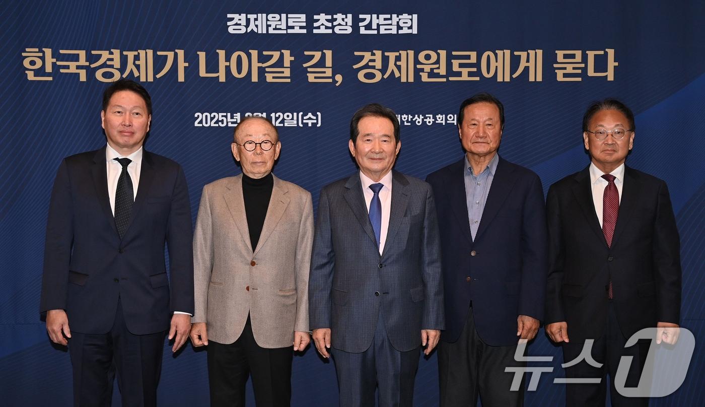 최태원 대한상공회의소 회장(왼쪽부터), 이헌재 전 부총리 겸 재정경제부 장관, 정세균 전 국무총리, 윤증현 전 기획재정부 장관, 유일호 전 경제부총리 겸 기획재정부 장관이 12일 서울 중구 대한상공회의소에서 열린 '경제원로 초청 간담회'에 참석해 기념촬영을 하고 있다. (공동취재) 2025.2.12/뉴스1 ⓒ News1 김진환 기자