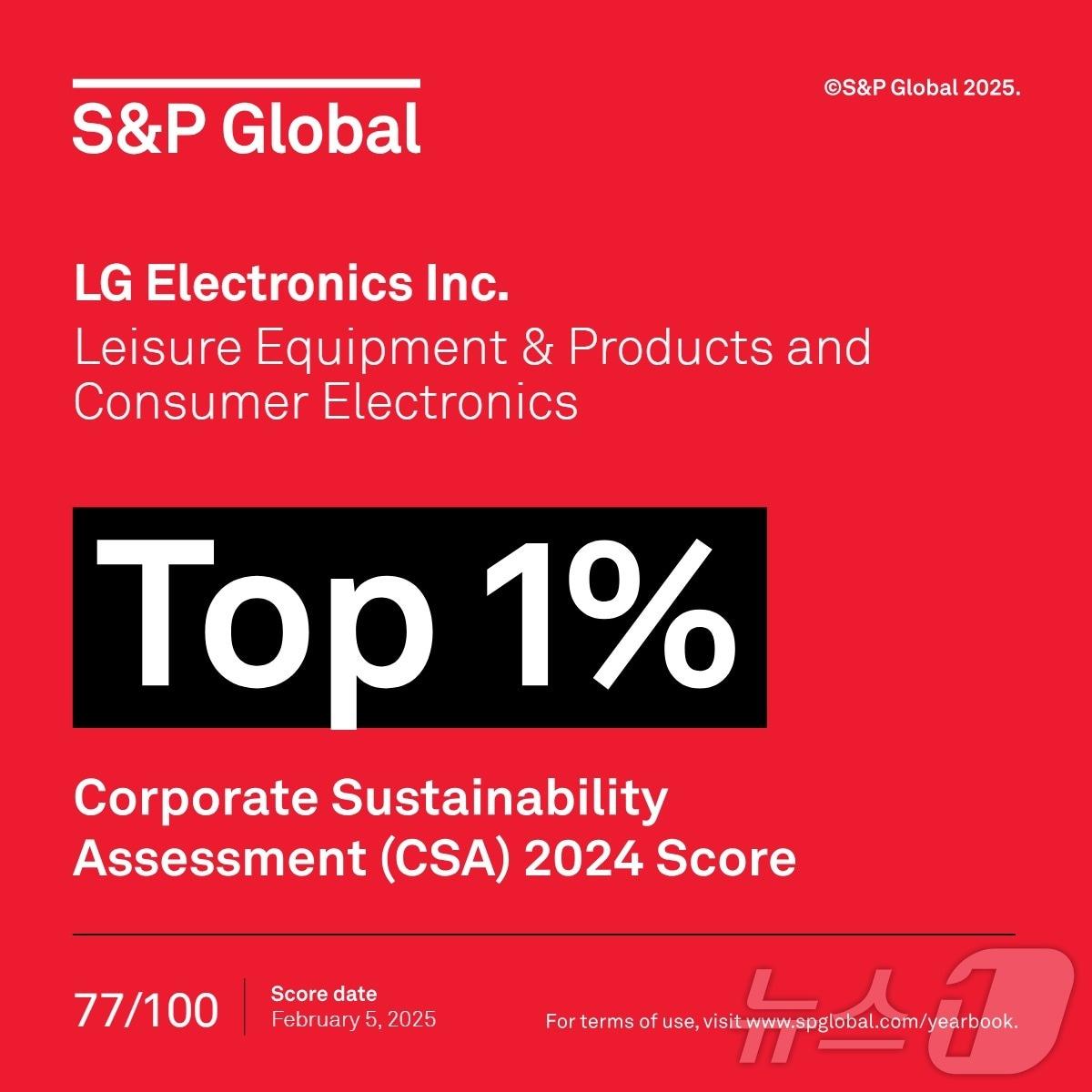 62개 산업군 7690개 기업 대상…가전 산업군에서 1위LG전자가 세계적인 신용평가 기관 S&P 글로벌이 발표하는 '기업 지속가능성 평가(CSA)'에서 2년 연속으로 최상위 등급에 해당하는 '톱 1%'에 선정됐다(LG전자 제공). ⓒ 뉴스1관련 키워드LG전자박주평 기자 LS "에식스 상장 통해 5천억 조달, 美 특수 권선 제조시설 확충"벤츠·엔비디아 '자율주행' 동맹…삼성·LG 전장사업 기회 열린다관련 기사1~11월 전기차 배터리 음극재 적재량 124만톤…전년比 35%↑"8거래일 연속 랠리" 코스피 또 '사상 최고'…현대차, 7% 급등[개장시황]벤츠·엔비디아 '자율주행' 동맹…삼성·LG 전장사업 기회 열린다'CES서 확인한 로봇 시대'…삼성·LGD, OLED로 시장 주도권 노린다허웅·송교창 복귀한 KCC, 소노 96-90 제압…6연패 탈출