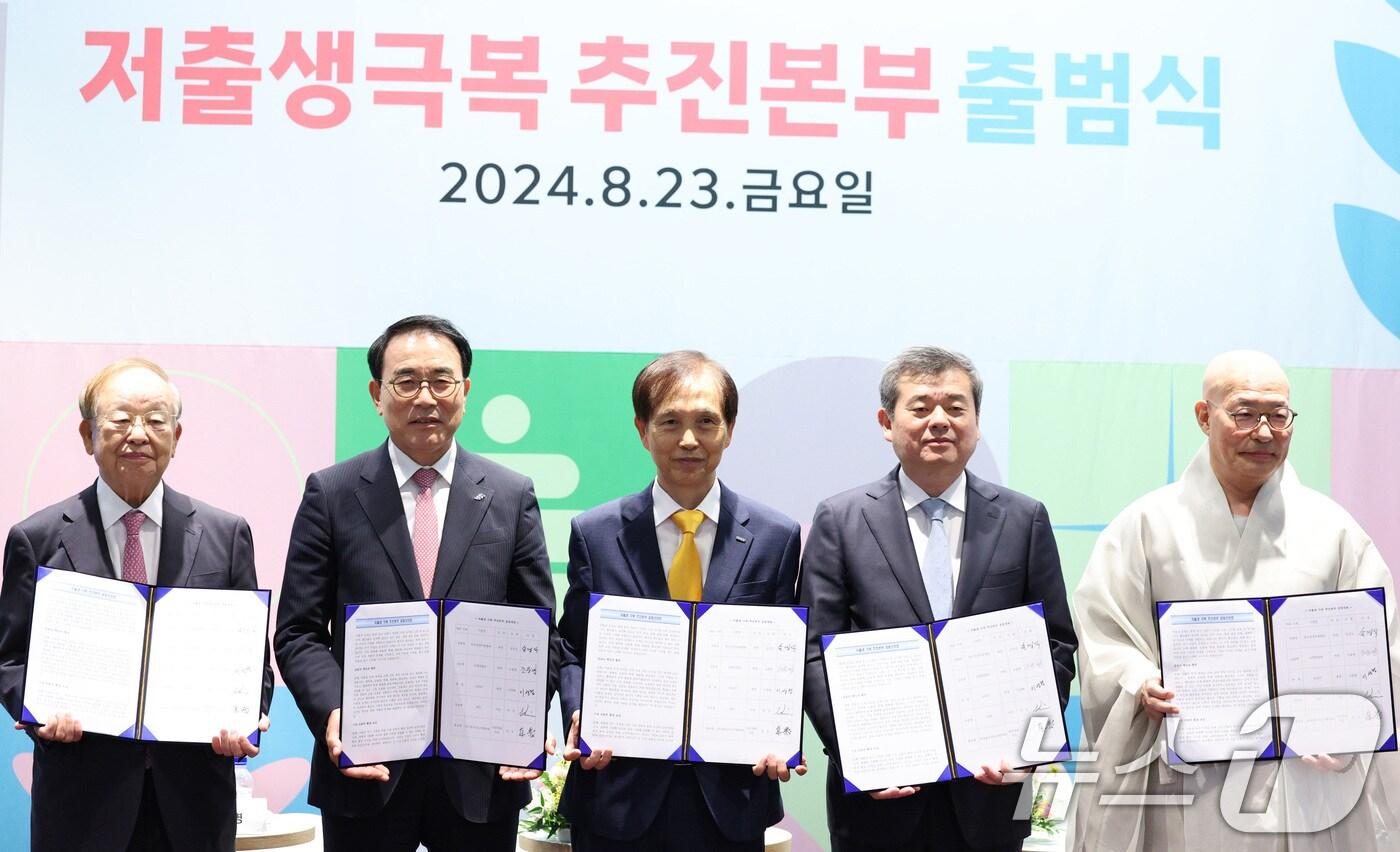 손경식 경영자총연합회장(왼쪽부터), 조용병 은행연합회장, 이광형 카이스트 총장, 박민 KBS 사장, 진우 스님이 23일 오후 서울 강남구 코엑스에서 열린 저출생극복추진본부 출범식에서 공동선언문을 들고 기념 촬영을 하고 있다. 2024.8.23/뉴스1 ⓒ News1 신웅수 기자