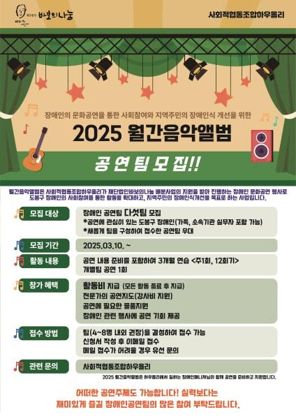 3월 한 달간 ‘월간 음악앨범’ 사업 참여할 장애인공연팀 모집사진=사회적협동조합하우올리 제공이재상 기자 "민간 출자자 협업 확대한다" 한국벤처투자 조직 개편 단행"대한민국 이노비즈기업이 초격차 기술혁신으로 함께할 것"