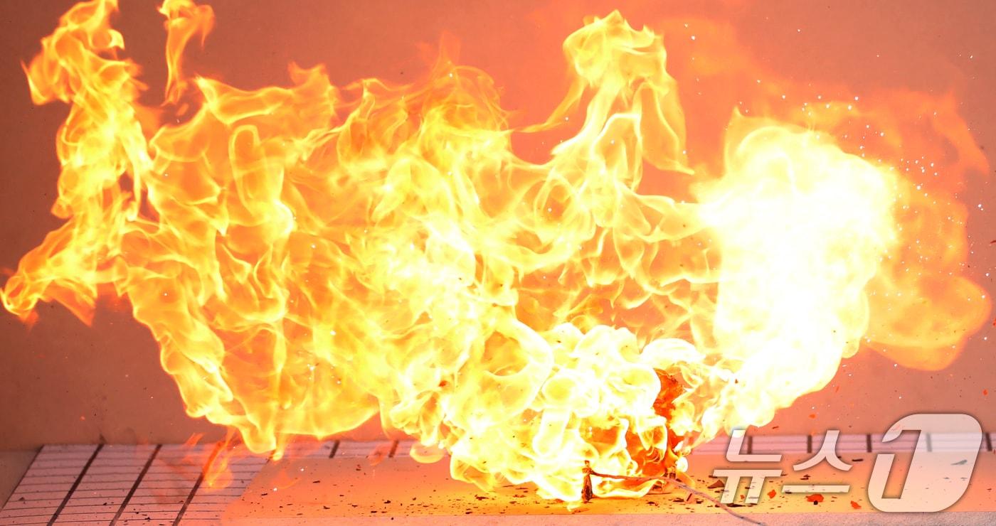 보조배터리와 전자담배 등 항공기 기내 안전관리 강화 대책이 시행 중인 가운데 부산 연제구 부산소방재난본부에서 보조배터리 열폭주와 안전보관 방화팩 검증 실험이 진행되고 있다. 이번 실험은 발열, 물리적 충격, 과충전 등의 조건에서 리튬이온 배터리가 어떻게 반응하는지를 관찰하는 방법으로 진행됐으며, 배터리의 안전한 보관법을 마련하기 위해 아라미드 소재인 소방관 폐방화복으로 부산소방재난본부가 제작한 안전보관 파우치(방화팩)의 성능검증도 병행됐다. 2025.3.12/뉴스1 ⓒ News1 윤일지 기자