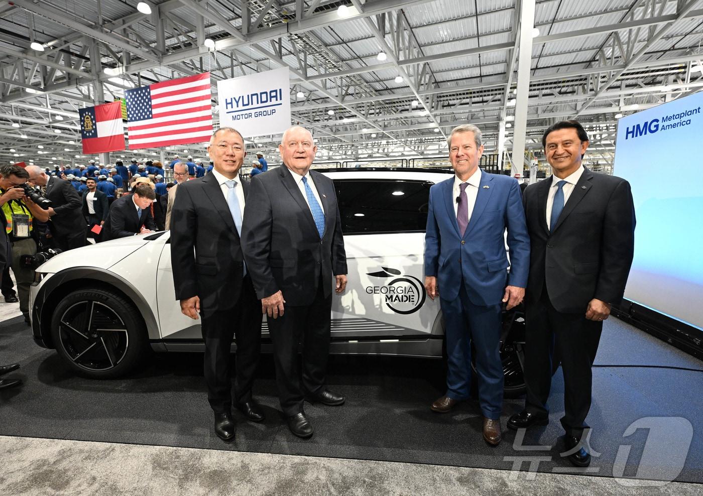 정의선 현대차그룹 회장이 26일(현지시간) 미국 조지아주 엘라벨에 위치한 ‘현대자동차그룹 메타플랜트 아메리카(Hyundai Motor Group Metaplant America, HMGMA)’ 준공식에 참석해 생산된 아이오닉 5 차량에 서명 후 참석자들과 기념촬영을 하고 있다. 왼쪽부터 정 회장, 소니 퍼듀(Sonny Perdue) 전 조지아 주지사, 브라이언 켐프(Brian P. Kemp) 조지아 주지사, 호세 무뇨스(José Muñoz) 현대차 대표이사 사장(현대차그룹 제공, 판매 및 DB 금지) 2025.3.27/뉴스1