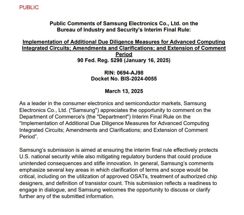 美 상무부, 파운드리 기업에 고객사 정보 보고 의무화 삼성 파운드리, 中 고객사 영향 우려해 규제 완화 의견 낸 듯삼성전자가 미국 상무부에 제출한 의견서. ⓒ 뉴스1관련 키워드삼성전자박주평 기자 LS "에식스 상장 통해 5천억 조달, 美 특수 권선 제조시설 확충"벤츠·엔비디아 '자율주행' 동맹…삼성·LG 전장사업 기회 열린다관련 기사구미시 'AI혁신TF' 가동…"AI 중심으로 산업 구조 재편"결국 구글 손잡은 애플…'AI 동맹' 맺고 아이폰에 제미나이 탑재나주시, RE100 반도체 클러스터 유치 본격화…"용수·전력 풍부""8거래일 연속 랠리" 코스피 또 '사상 최고'…현대차, 7% 급등[개장시황]하만 JBL, '사운드바 시리즈' 신제품 출시…미묘한 음향 차이 완벽 재현