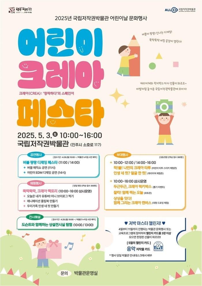 5월 3일, 온 가족이 함께 즐기는 어린이날 맞이 체험 행사 운영'창작'을 주제로 미니 브이로그·대형 드로잉 등 다채로운 프로그램 마련국립저작권박물관 어린이날 문화행사 홍보물 / 사진=한국저작권위원회 제공국립저작권박물관 전경 / 사진=한국저작권위원회 제공이재상 기자 한성숙 "욕 먹으면서 좋아진다" 즉석 조언…"너무 짧았다" 한계도(종합)'깜깜이 편성' 지적받은 공영홈쇼핑…한성숙 "공공성 높여라" 질타